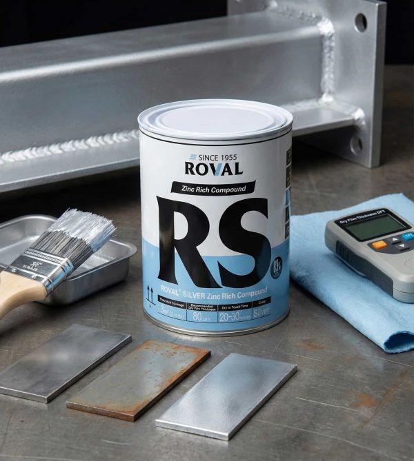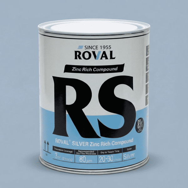 Pakistan’s climate and job-site realities accelerate rust on steel, especially at weld seams, cut edges, fasteners, and outdoor joints. ROVAL SILVER Zinc Rich Compound is engineered to repair aged galvanizing and deliver a clean, hot-dip galvanized-look silver finish on visible steelwork in Pakistan. It can be applied as a standalone zinc-rich cold galvanizing compound system on new steel assemblies where hot-dip galvanizing is not practical, or used as a top coat over a ZRC cold galvanizing compound base when you want layered corrosion protection plus colour matching. With 83% zinc in the dry film, it provides zinc-rich performance beyond ordinary paints for harsh wet-dry cycles, industrial fallout, and outdoor exposure, protecting high-risk zones around weld seams, cut edges, bolts, and brackets.